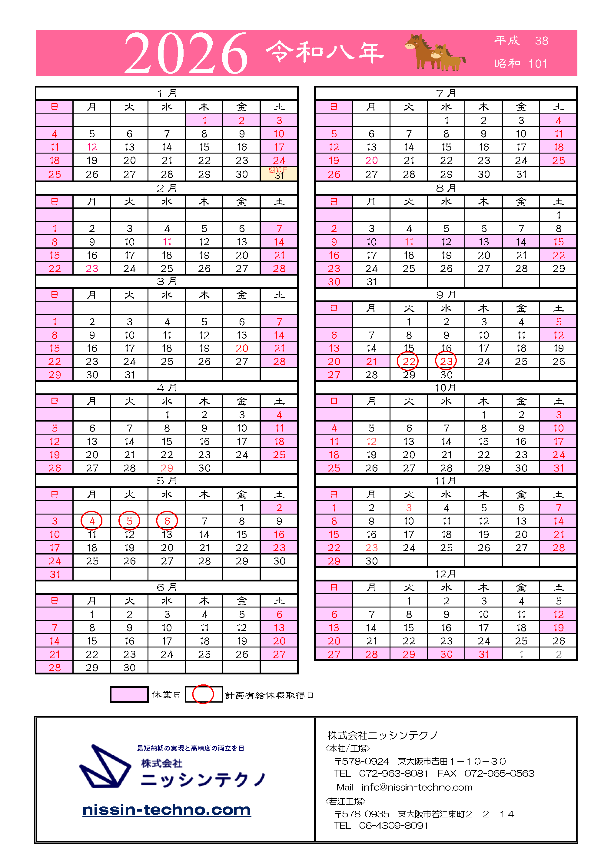 2025-12-08 / 最終更新日 : 2025-12-08 nissintechno ブログ 2026年(令和8年)営業カレンダー 2026年(令和8年)の営業カレンダーです ⇒ 2026年カレンダー
